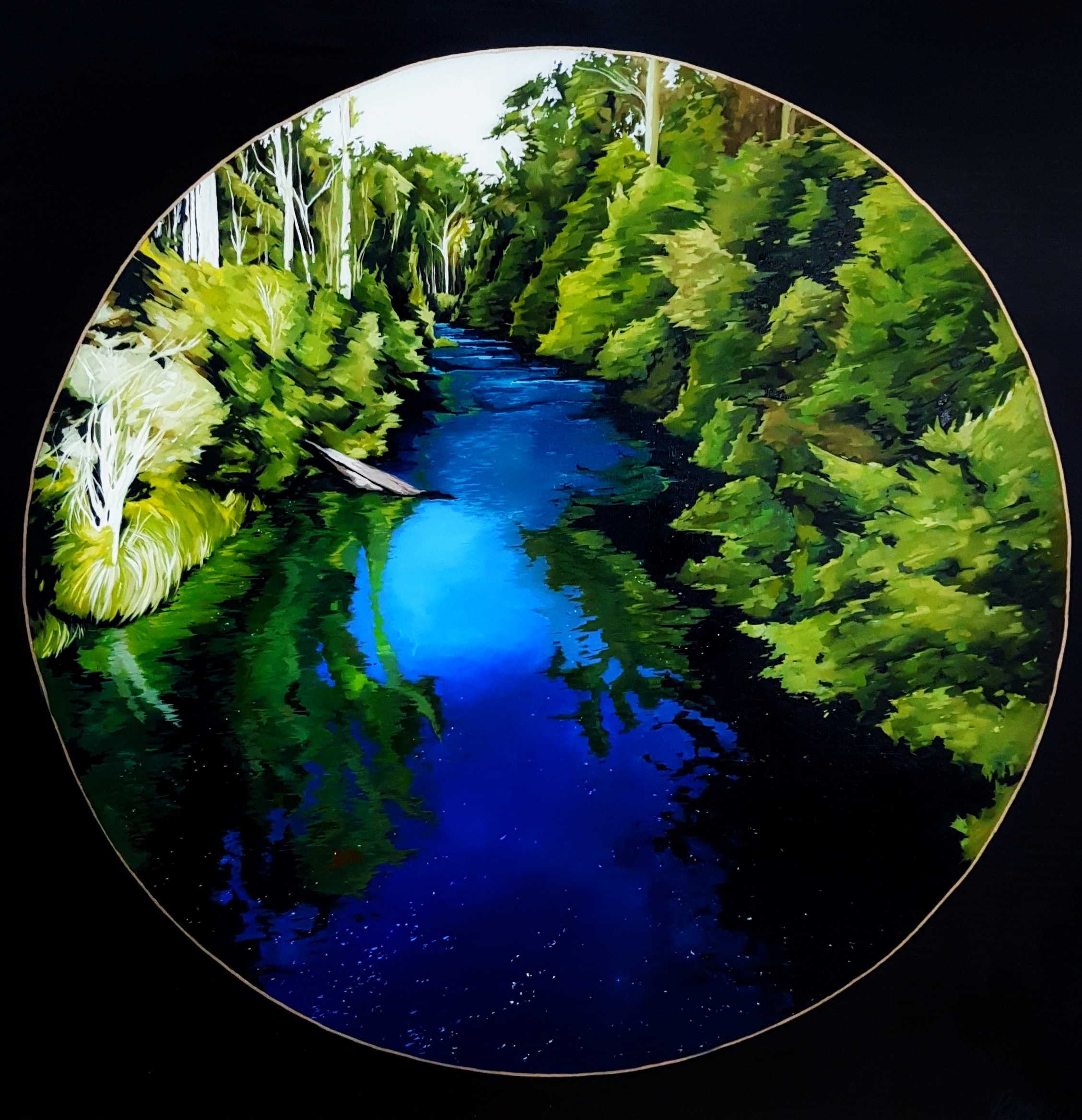 The series of circular paintings that depict the Weld, Styx and Arve rivers that flow into the major waterways in the far south are stereo views of place. The titles of the works eludes to a historical implement for viewing. The stereoscope was a device once used to view far distant lands that were difficult to access. It allowed folk to travel without leaving home. These works speak of a time when perhaps these spaces are no longer in existence.
