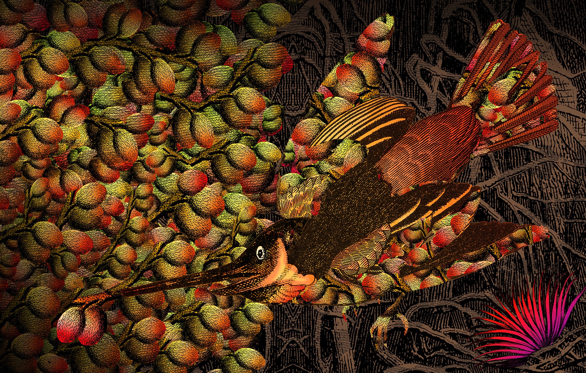 “Hybridity” also refers to Milojevic’s approach to printmaking media – one of applying or layering traditional methods onto new technologies. Digital/woodcut refers to the layering of the inkjet print with woodblocks.