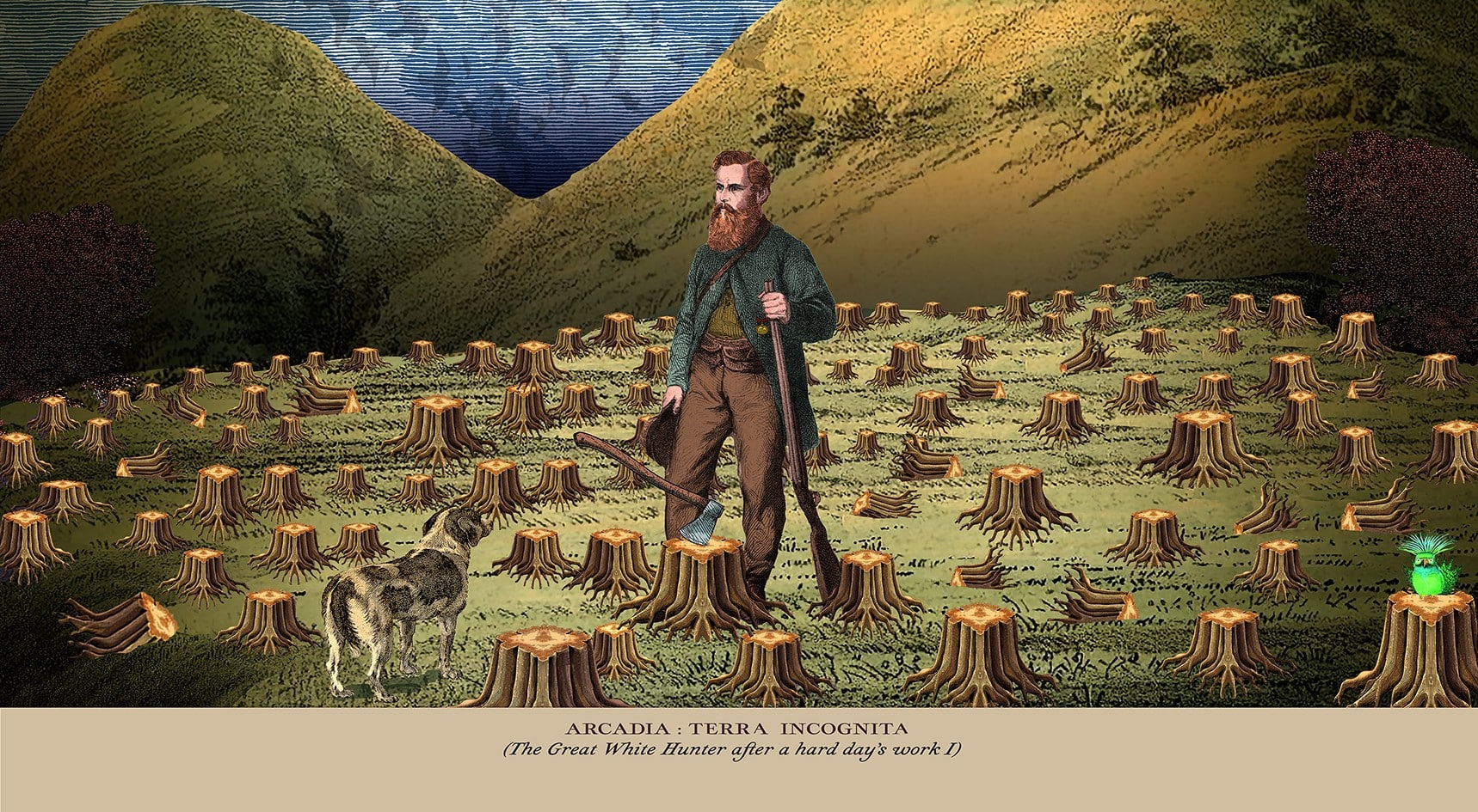 His work evolves from two worlds – one evocative of a European landscape and the other reminiscent of a Tasmanian one. The images change so that one world disintegrates as the other gradually comes to the surface. These complex constructions originate from a collection of marks and textures built up over many years that have been borrowed from wood engravings dating back to the nineteenth century. The marks are scanned into the computer and then reconstructed into imaginary landscapes. They are a “hybrid”.