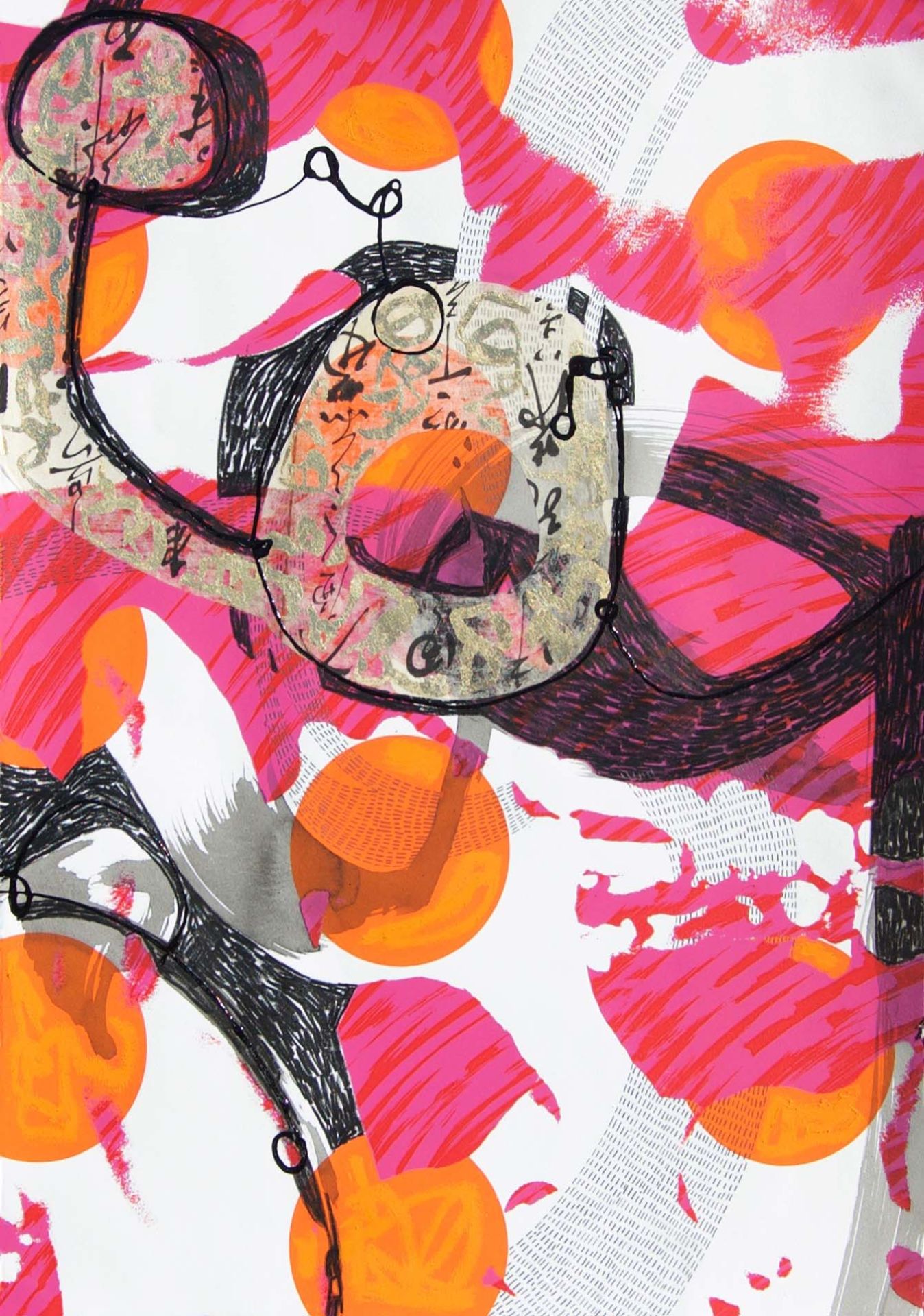 I have an ongoing interest in the conceptual exploration of memento mori, a Latin phrase that may be translated as ‘remember that you are mortal’. For my MFAD I developed a body of work titled Bonescapes, each work originating with an abstraction of skeletal form. With the application of additional layering, the transience and impermanence of life is explored through the energetic gestural movement of line and colour.