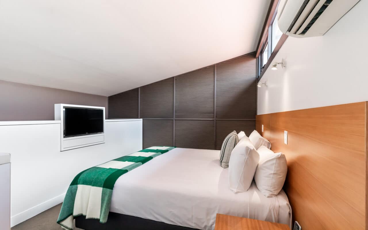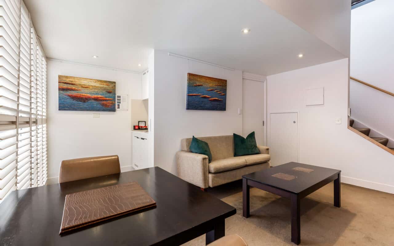 Separate from the heritage building, these rooms are modern, compact spaces. With a small living area on the ground level and a loft-style bedroom accessed by stairs, the corporate studio offers a cosy place to sleep after a day exploring Hobart.
