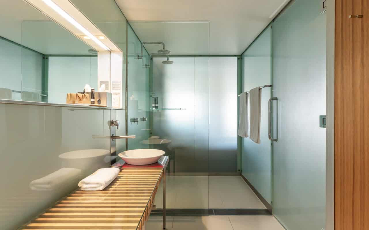 Euro-style stainless steel and translucent glass bathrooms feature a common centrepiece – the indulgent Kohler SOK Overflowing Spa.